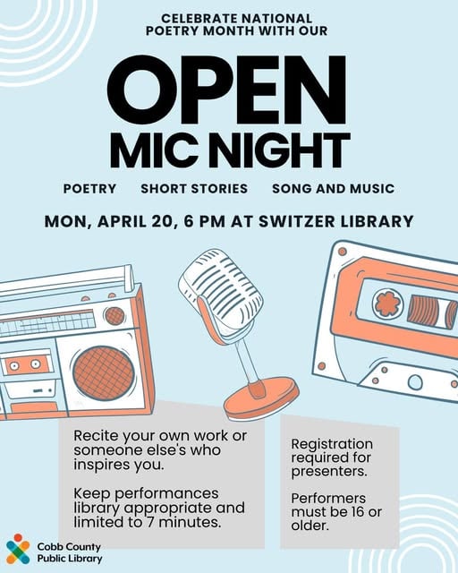 Celebrate National Poetry Month by performing at Switzer Library’s Open Mic Night on Monday, April 20, 2026 at 6 pm!