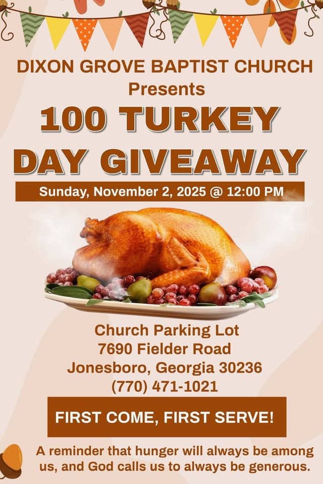 Dixon Grove Baptist Church is giving away 100 turkeys this Sunday, November 2, 2025. It’s a first-come, first-served distribution.