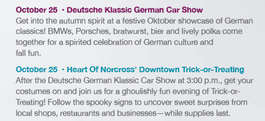 On Saturday, Oct. 25, 2025, the merchants of downtown Norcross will hand out candy, from 3 p.m. until supplies run out. Costumes encouraged!
