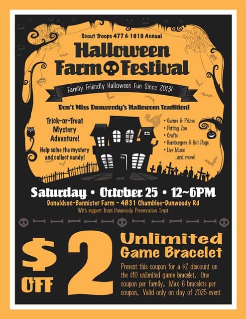 Come to the Halloween Farm Festival on Saturday, October 25, 2025, from noon to 6 p.m. It is FREE to attend (with fees for activities) and takes place at Donaldson-Bannister Farm in Dunwoody.