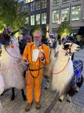 On Thursday, November 20, 2025, Uptown will host the fifth annual Laughs, Llamas, and Pajamas event. (Uptown was formerly known as Lindbergh City Center and it’s right next to the Lindbergh MARTA station.)