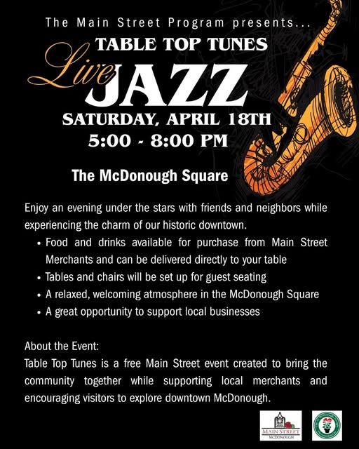 The McDonough Main Street Program is hosting Table Top Tunes, a special community evening, on Saturday, April 18, 2026 from 5 to 8 p.m.