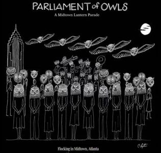 On Friday, August 3, 2018, head to Midtown Atlanta for the Parliament of Owls, an owl-themed lantern parade. For this event, the Parliament of Owls are opting for a black-and-white theme–The owls themselves are white masks illuminated by a flashlight (your phone’s will suffice), and their (and your) attire is black. If you’ll be donning a mask & bringing a lantern to join in the parade, please stick to the costuming theme.