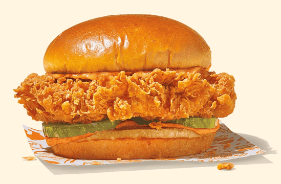 Spicy Chicken Sandwich – A juicy chicken breast fillet marinated in Popeyes seasonings, hand battered and breaded in the restaurant’s buttermilk system and fried until golden brown — served on buttery toasted brioche bun with pickle slices and spicy mayo.