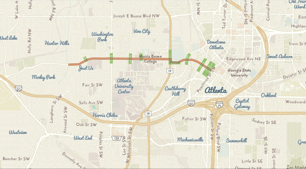 From west to east, it starts at the point where MLK Drive crosses the BeltLine Westside Trail, then follows MLK Dr. through Vine City, where it then follows Mitchell Street to the South Downtown area, ending just before the Georgia State Capitol.